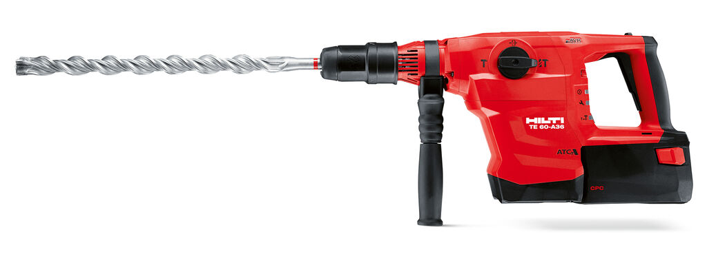 By putting emphasis on comfortable and fatigue-free work, this high-performance combihammer with a weight of only 7.9 kg was designed for heavy-duty concrete drilling and hammering. A low vibration level enables particularly precise handling. The cordless operation of the device offers advantages with regard to mobility and ergonomics, while ensuring the same performance as wired solutions. With eight joules of impact energy, the TE 60-A36 is an extremely powerful tool.