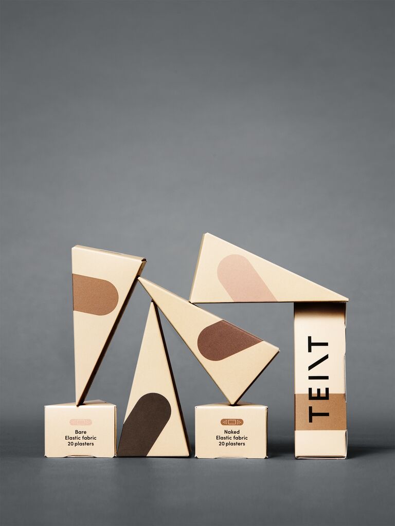 Teint captivates with the idea of plasters that are adapted to the personal skin tone. The minimalist concept implementation lends this type of product a completely new look and value. This is particularly evident in the graphic design and the triangular shape of the packaging, interpreted in the sense of a dispenser. Added to this is a functionality that is perceived as pleasant in the case of injuries, as the plasters can be removed individually and with just one hand.