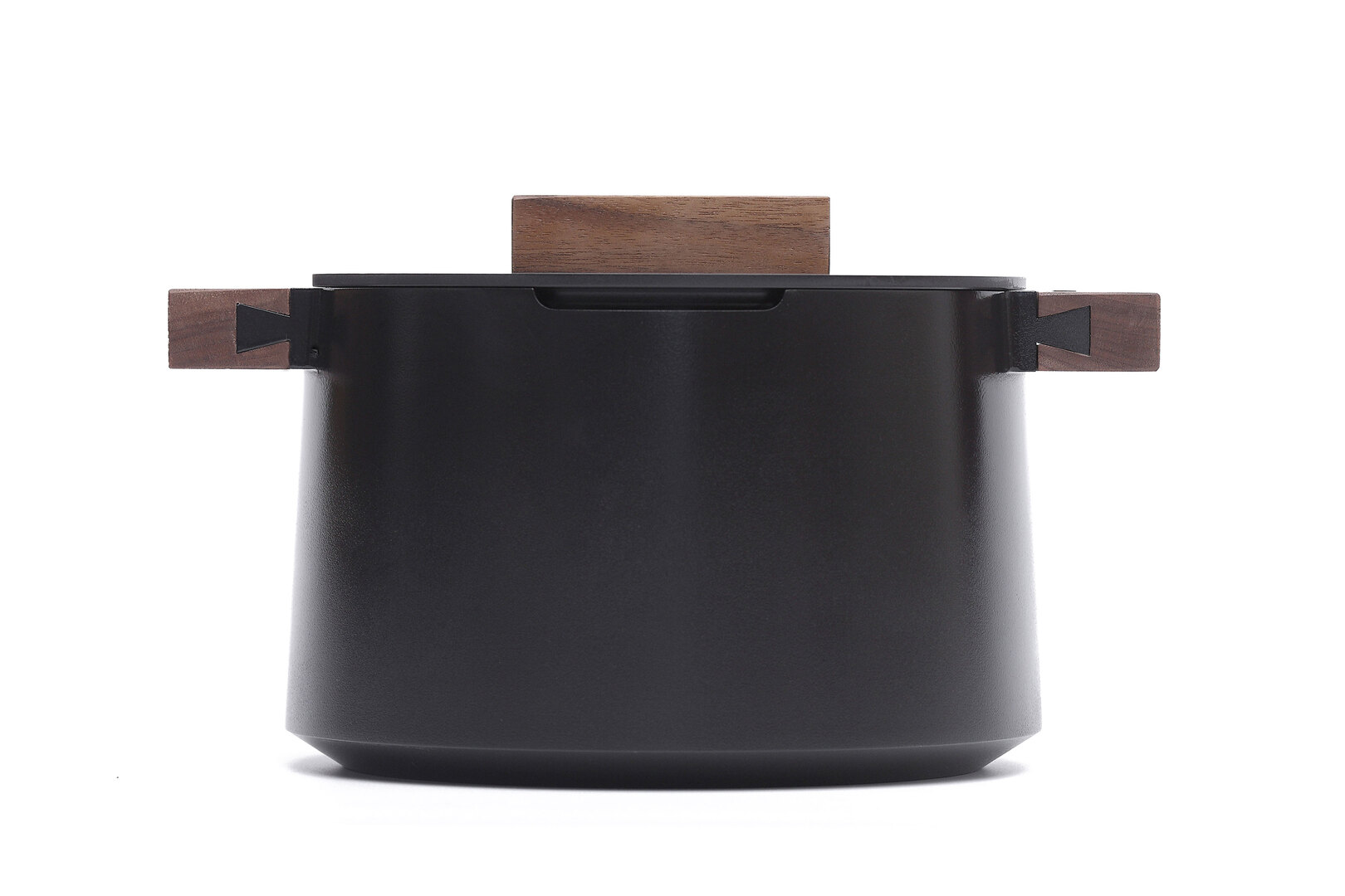 The pot is also designed to be used with different handles or without handles at all. Removing the handle allows the air pressure in the pot to be controlled. Lastly, the larger contact surface at the base of the pot perfectly conducts thermal heat through the carbon itself, allowing food to be cooked evenly.