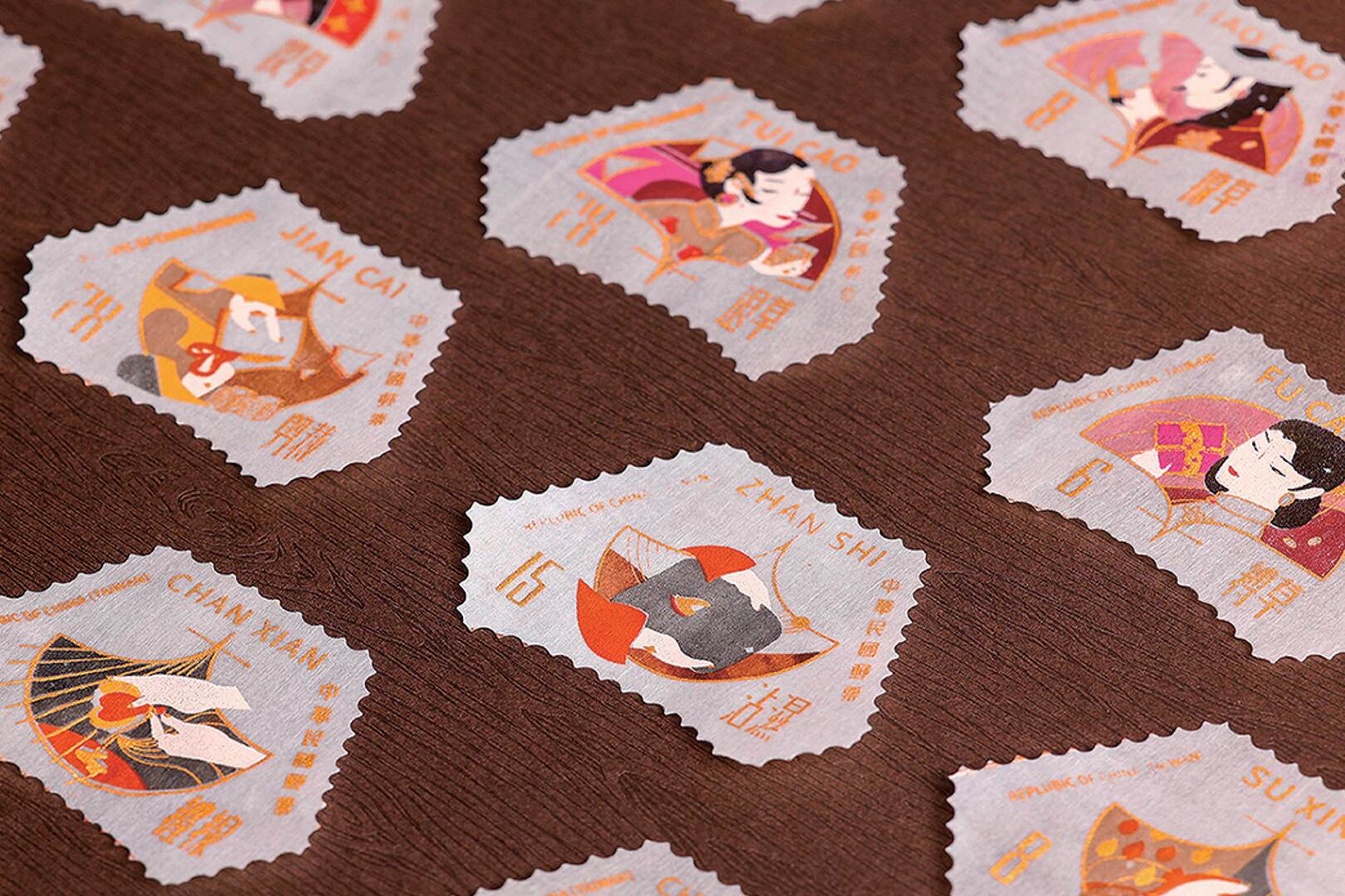 The artworks on the stamps were inspired by the Qing Dynasty concubine’s headdress, as the papyrus paper flower was the main ornament of the concubine's hair. To showcase the unique process and characteristics of Tetrapanax paper, the first stamp set depicts each of the seven steps of the Tetrapanax papermaking process; the second depicts the process of making Tetrapanax paper flowers; and the third depicts the seven flowers commonly made of Tetrapanax paper.