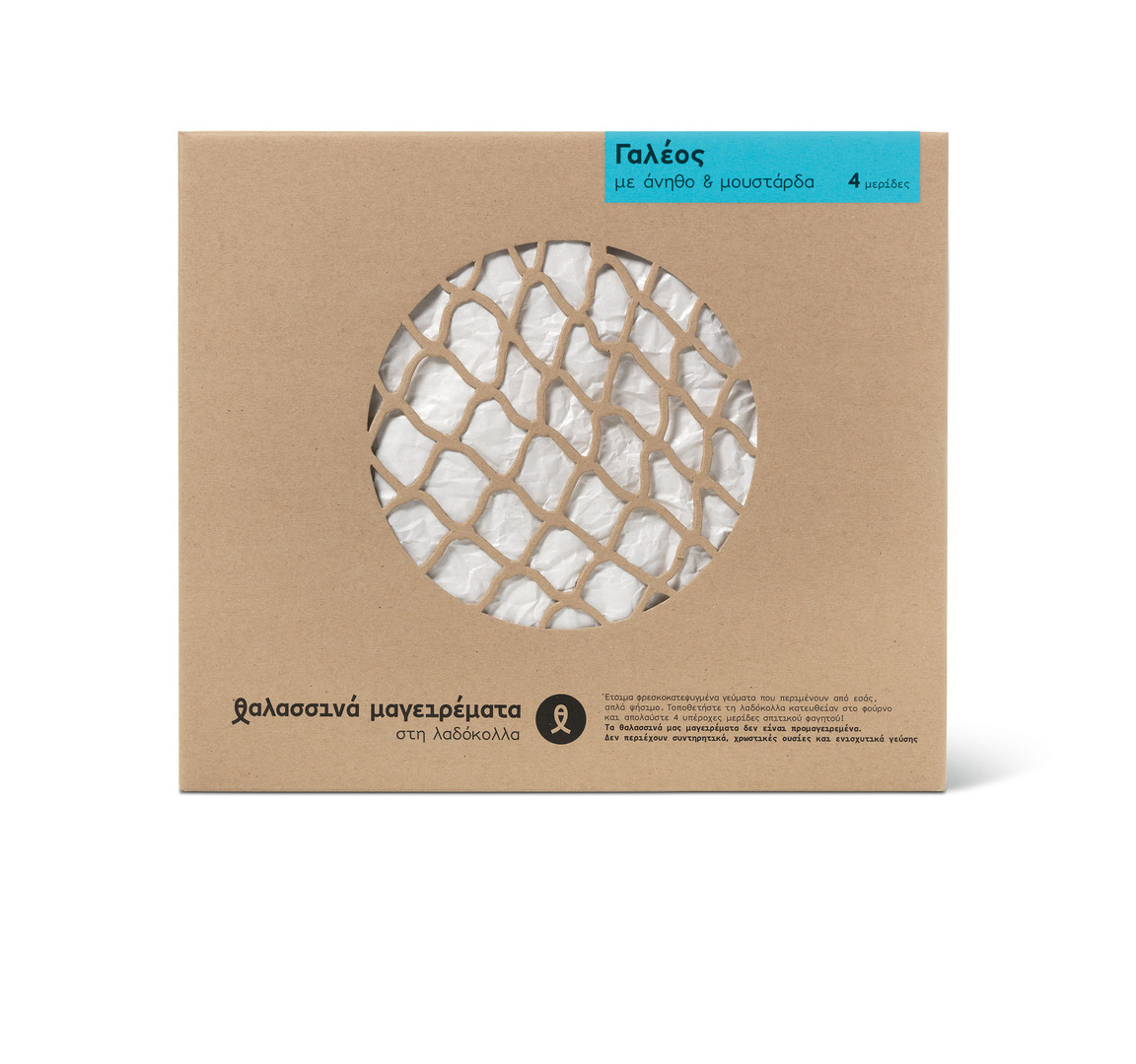 The newly developed packaging solution for the Greek brand Thalassios Kosmos puts the product centre stage: the frozen fish and seafood wrapped in aluminium foil are visible through the mesh-covered window of the packaging box. With a simple design, the flat carton allows for easy differentiation between the products and also maintains its temperature. The design of the distinctively positioned logo is derived from the initial letter “theta” of the Greek alphabet, and its contours echo the shape of a fish.