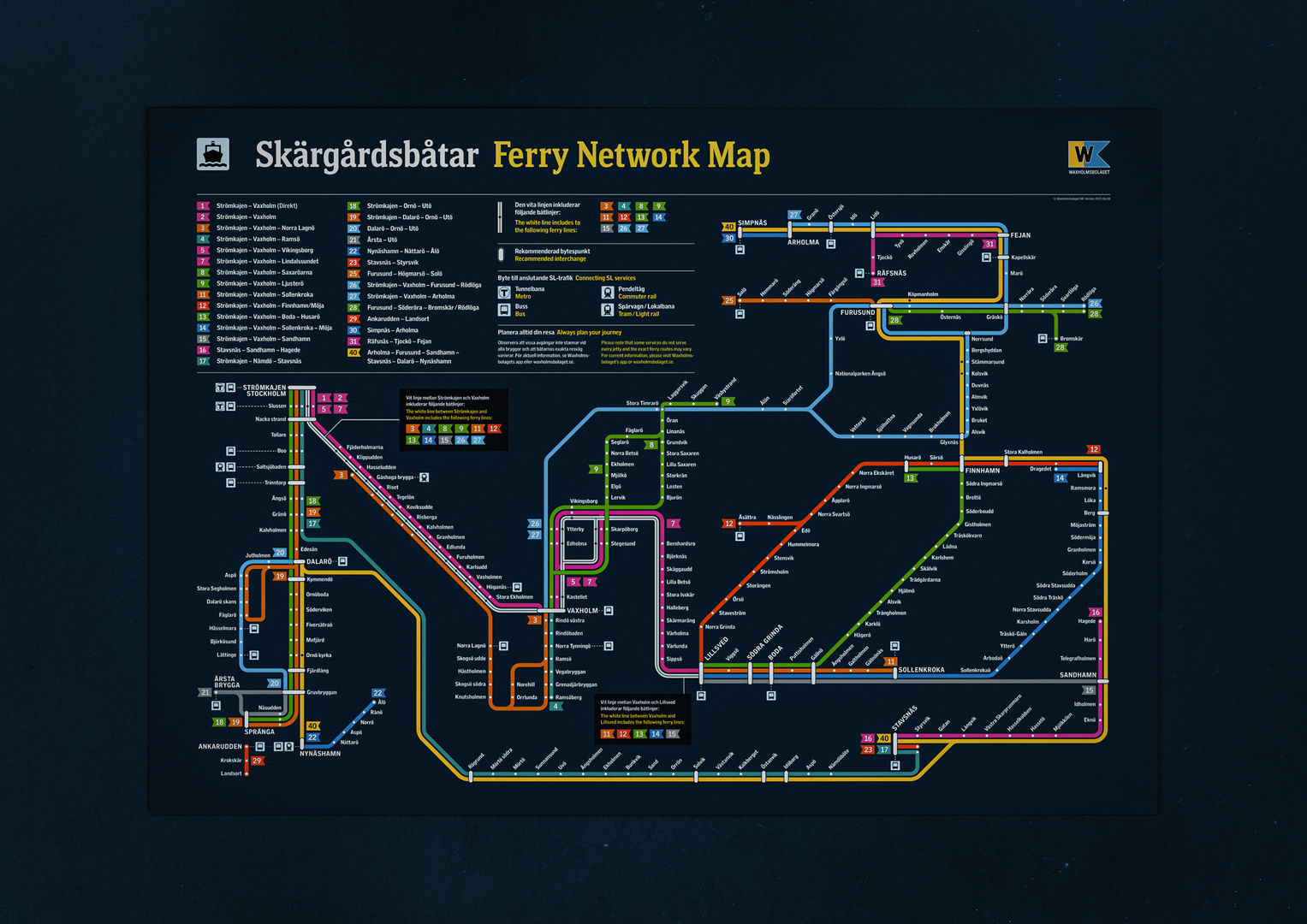 The Ferry Network Map is an innovative, schematic map which is based on established navigation principles and thus makes it easier to identify the ferry route, stops and transfer points. The key visual elements of the map are specific colours, distinctive route symbols and a new typeface. They lay the foundation for an improved travel experience. The map also visually highlights the connection between the ferry company and Stockholm’s public transport services.