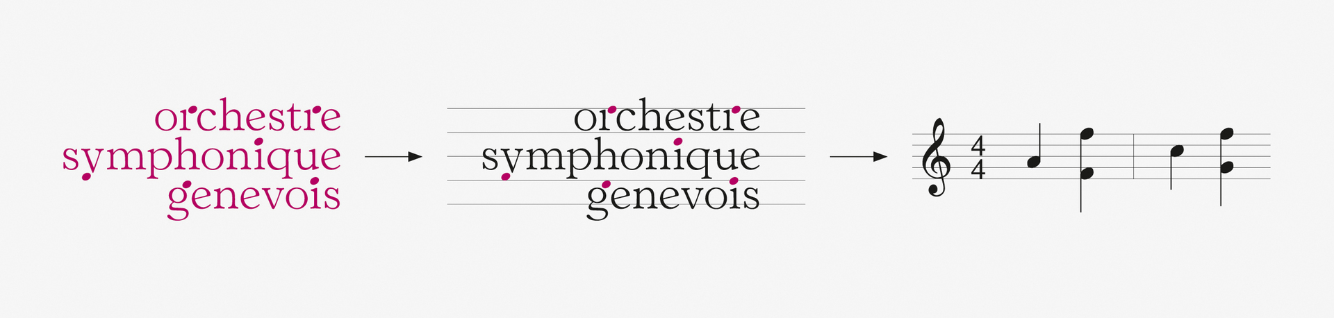 The new brand identity of the Orchestre Symphonique Genevois combines the elegance of classical music with modern means of communication and interactivity. The corporate design breaks the usual boundaries by including acoustic dimensions along with visual aspects: Note heads replace certain parts of the letters of the word mark and a font was developed, which converts text into music. The new brand identity is found in all of the orchestra’s communication media, from corporate stationery to mobile applications.
