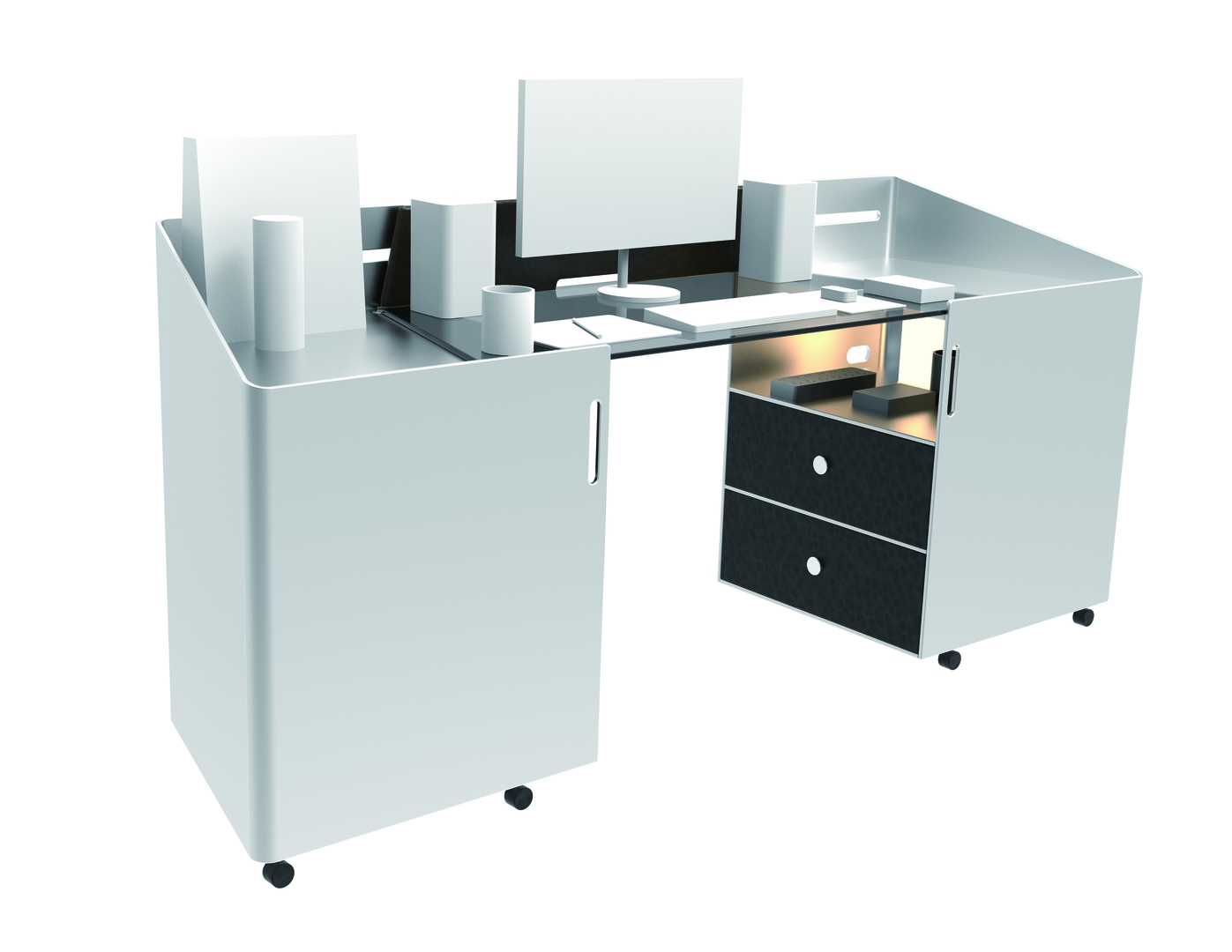 In the “mobile mode”, without having to take anything away from the desktop, the risen edge around the desk keeps things from falling off the desk due to inertia. The user can also use this edge as a handle to pull the whole suite away. While working in the “desk mode”, the risen edge does not come in the way of arms and hands because it slides away. This also creates a wider desk surface and more space for the legs and feet.