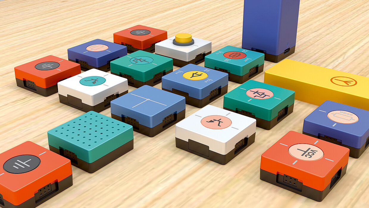The Pipe Circuit introduces children to the topic of electricity in an intuitive and playful manner. Using the flow of water as an analogy to the flow of electricity, the battery boxes are designed like water towers. Various electronic components can be combined with each other by means of a modular system. If a circuit is correct, a path lights up to visualise the flow of electrons. Each module has an integrated protection circuit to ensure maximum safety.