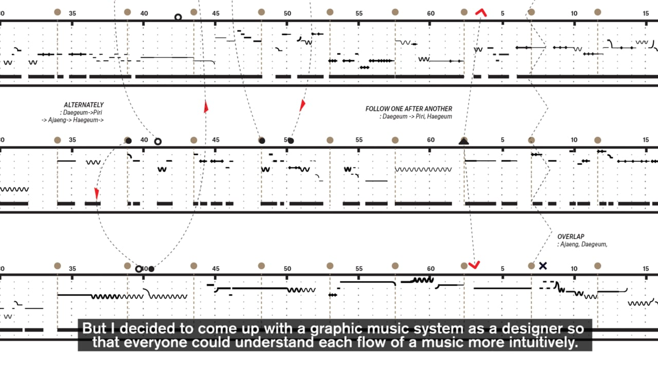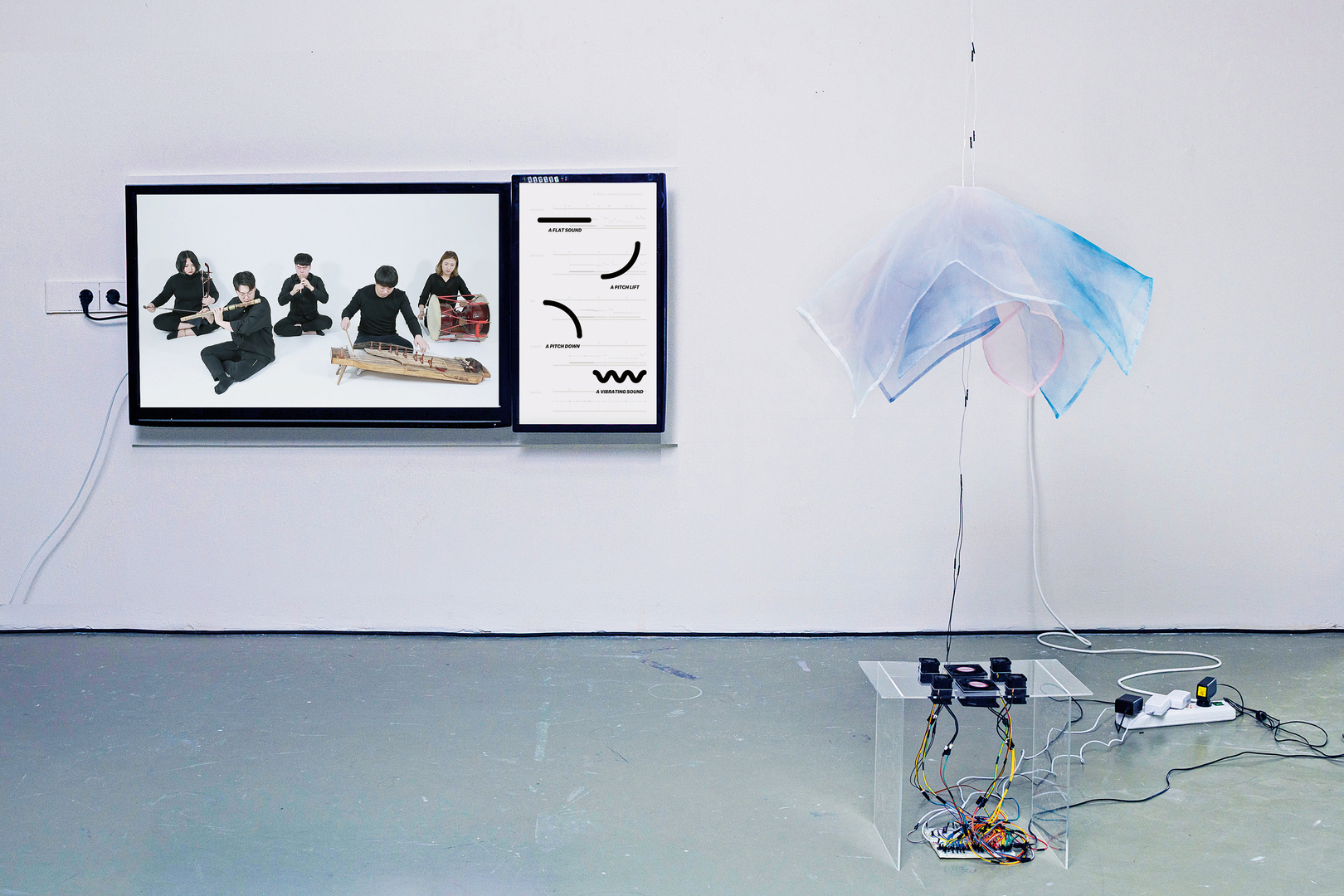 This work introduces Sinawi, an ancient form of Korean folk music, which originally accompanied the dancing and singing of a shaman. While the audience is shown a video with an ensemble playing Sinawi, the improvised sounds are reflected in a special music score. In addition, a handkerchief, driven by a motor and fans, mimics the performance of a dancer. Through the finely tuned interaction of media, the information concept draws attention to the traditional music. It communicates the vigour of the sound in a modern and particularly lively manner.