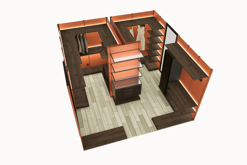 The TLE Walk-in Closet offers a high degree of functionality and spatial capacity. Convincing in its simplicity and reduced design, it appeals to the senses.