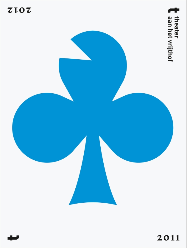 Every year, a visual theme for all external communication is designed for the coming season at the Theater aan het Vrijthof in Maastricht. For the 2011/2012 season, this visual system plays with the symbolism of playing cards: a modified version of hearts, clubs, diamonds and spades form the basis for all promotional materials, triggering associations with the idea of “a play”. In bold colours and with a triangular notch reminiscent of a punched ticket, the motifs speak a consistent language – down-to-earth yet at a high artistic level.