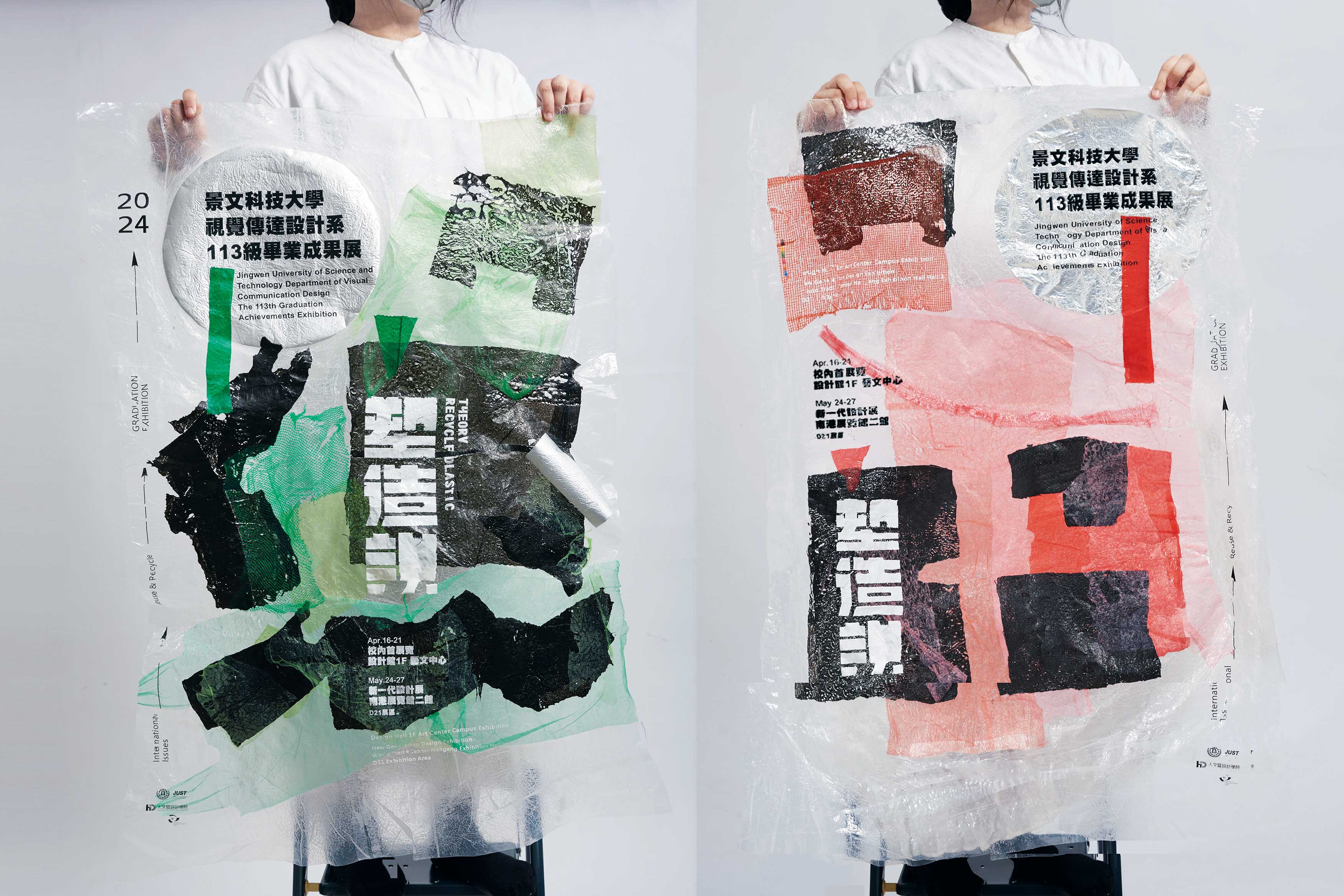SHAPE (塑) / CREATION (造) / DELIVERY (說): Recycled plastic materials are transformed into versatile media, highlighting the potential of sustainable design.The materials for these plastic posters are sourced from household recycling, including fruit net bags, packaging strings, and garbage bags. This approach highlights the impact of environmental issues on daily life and aligns with the United Nations Sustainable Development Goals. The repurposed plastic posters become book bands and packaging for special edition publications, retaining practical value as versatile packaging materials.