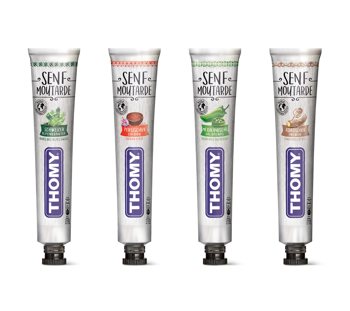 This new mustard range is available in four flavours. Following the motto “World Inspired Tastes”, ingredients such as Swiss Alpine herbs, Persian saffron, Mexican jalapeños or Asian ginger were added to the condiments. The products come in aluminium tubes with a matte texture aimed at achieving an original, modern appearance and distinguishing these new blends from the mustards with standard flavours. Their design features a coloured illustration of the respective added ingredient to indicate the flavour of the seasoning, complemented by an ethno-style border.