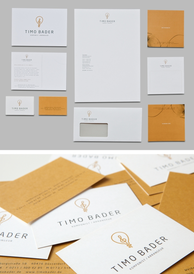 An artistic identity was created for composer and arranger Timo Bader: his corporate design presents itself as serious and valuable on the one hand, and as creative and extraordinary on the other. The logo is a combination of a light bulb and a clef, symbolising musical ingenuity and imagination. An unobtrusive font and elegant colours underline the composer’s artistic character. All in all, the corporate design comprises stationery, business cards, envelopes, invitation cards, a DVD/CD and nameplates.