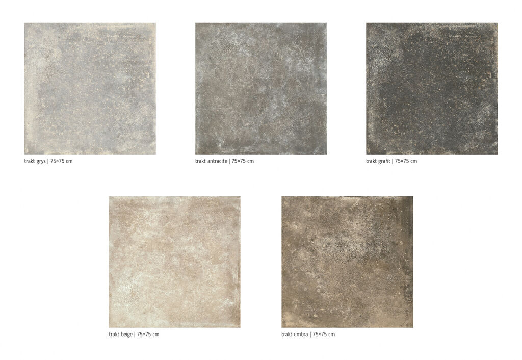 Thanks to modern digital technology, the surface of the Trakt ceramic tile range appears in varied forms and full of contrasts, just like natural materials. The tiles can take on the appearance of concrete, stone, soil or a country footpath. The collection offers a range of natural earthy tones, which lend themselves very well to being combined. The high-quality, precision-made tiles are manufactured with a tolerance of 0.2 mm and are suited for use in the home as well as in public spaces such as hotels, restaurants or shops.