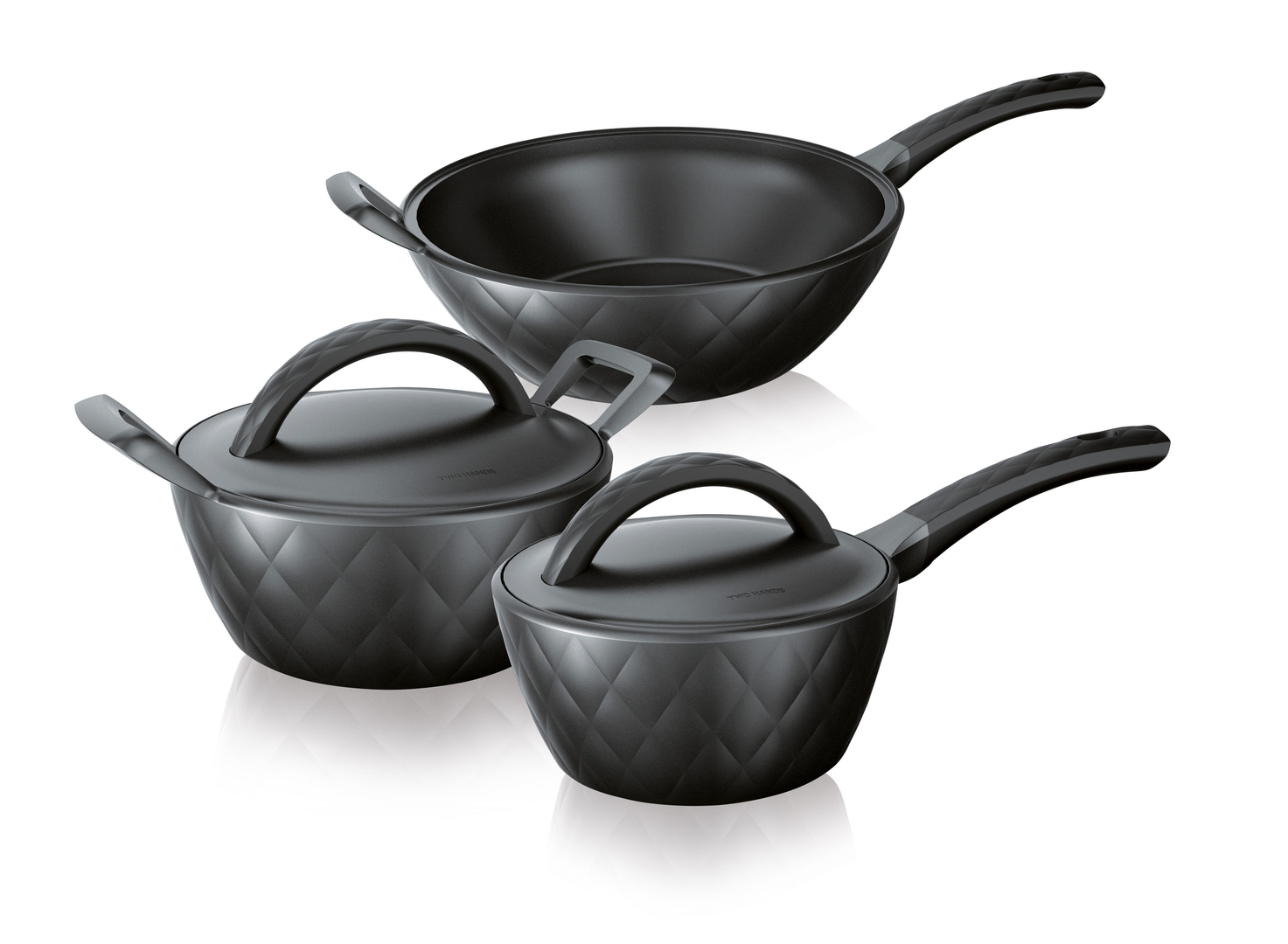 The Two Hands cookware is made of aluminium that is manufactured in a gravity die casting process. Thus, its thermal conductivity and heat distribution are improved. The product name emphasises the fact that this cookware is manufactured by hand. The quilted pattern on the lid handle as well as on the exterior of the pot underscores the manual design approach. The non-stick coating facilitates cooking and cleaning.