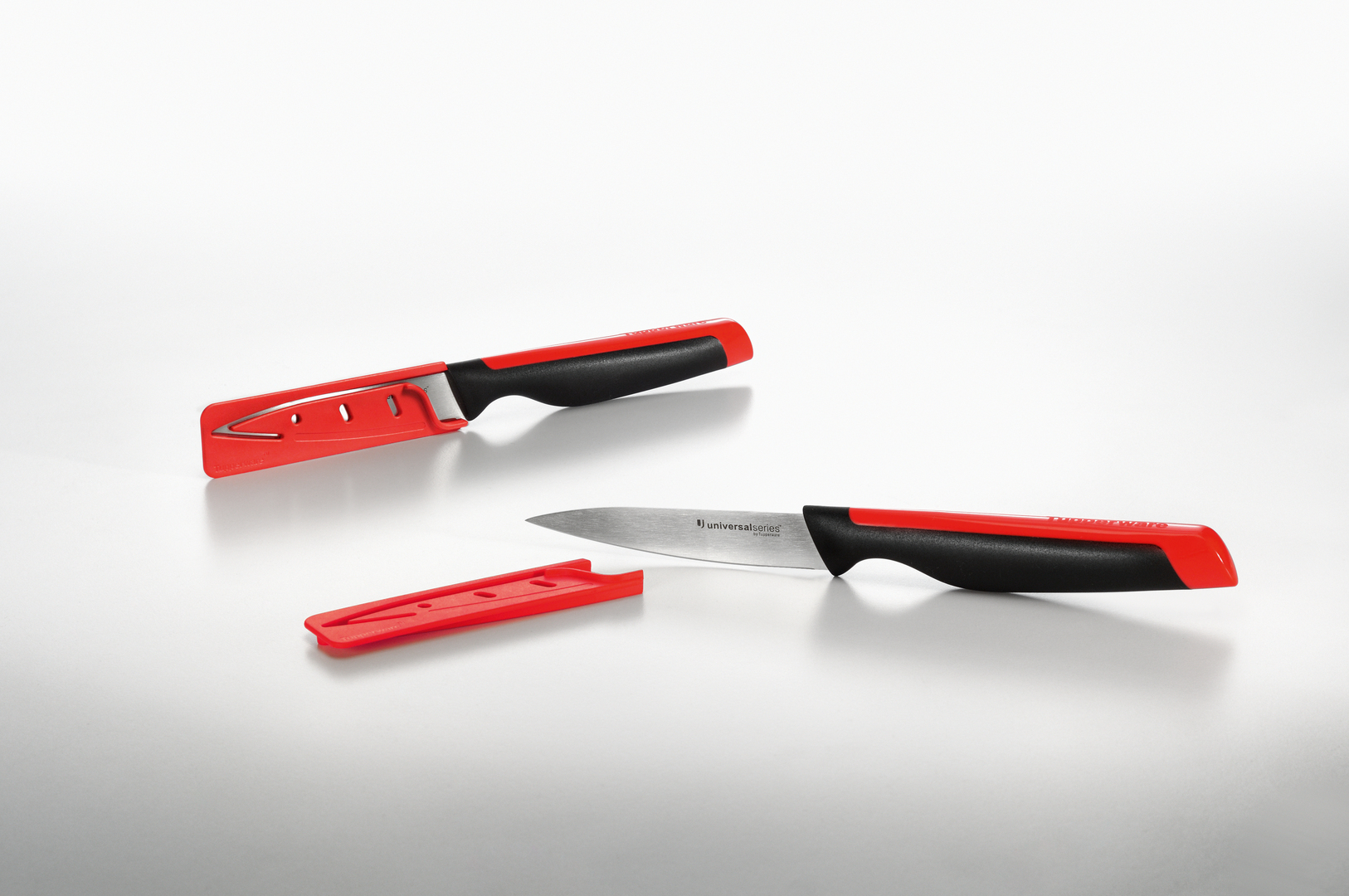 The distinctly designed knives of the U-Series accentuate the innovatively shaped handles with different colour surfaces making them an eye-catcher. Ergonomically mature, the knives lie comfortably and safely in the hand. They are well balanced, and due to their material properties, they cut with only minimum effort. The stamped blades are extremely sharp; manufactured from shining stainless steel, they follow a tapered form language. The serrated bread and tomato knives permit comfortable, easy and precise handling without crumbling or splashing fruit juice. Corresponding in colour with the handle, a strong sheath protects the blade from scratches when the knife is stored with other items in the drawer. In addition, it allows safe transport of the knife. The sheath colours match the colour accents at the knife handles so as to be more easily assigned.