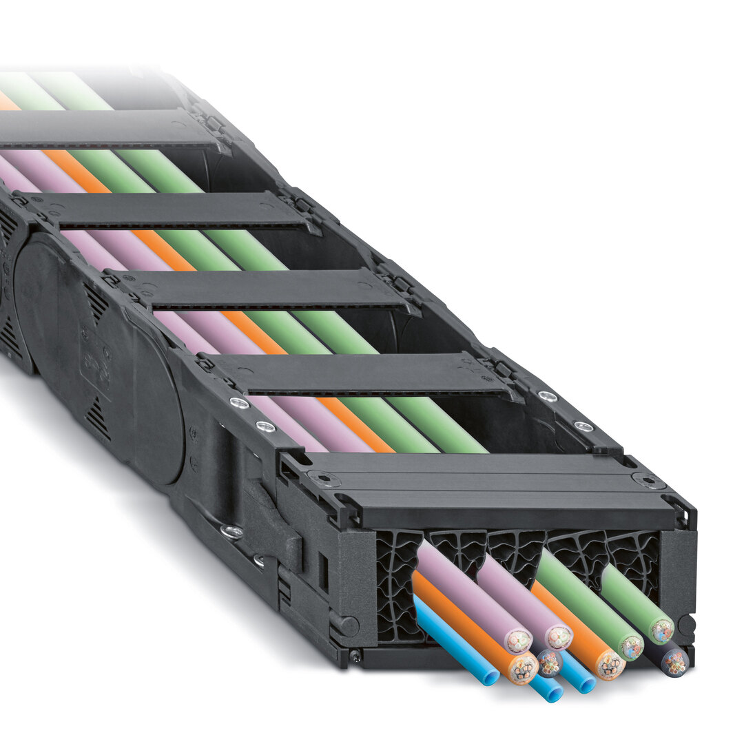 The universal strain relief CFU is an innovative solution for fastening cables and hoses. The soft elements surround the cables and hold them securely in place without damaging them. Visually similar to a honeycomb, the flexible structure adapts to different cable diameters. The simple closing mechanism, which can be opened on both sides, makes it easy to use the system without special tools and to modify it at any time.