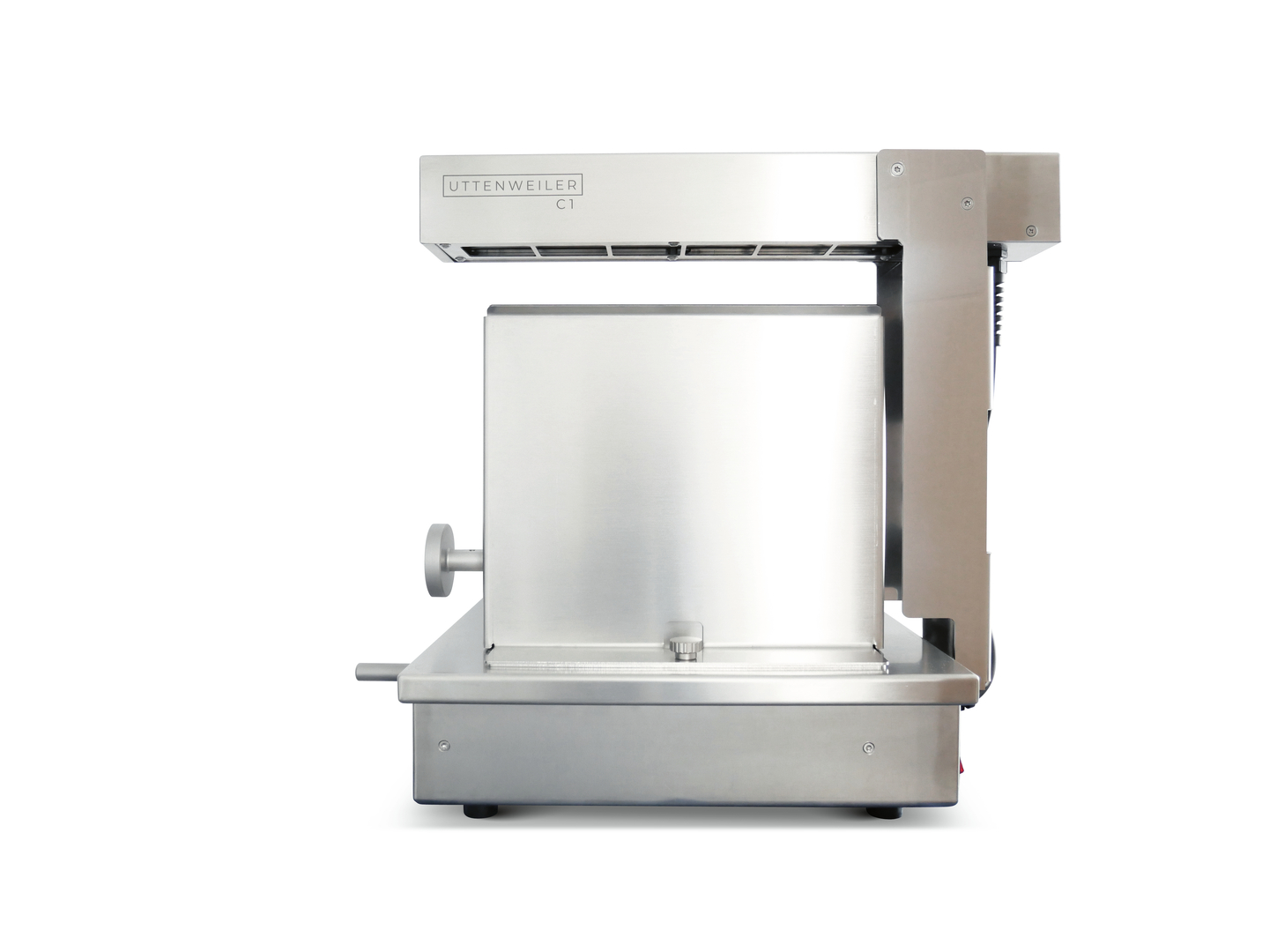 The UTTENWEILER C1 was developed for the quick melting of raclette cheese in the food service sector. To melt one portion, the heating element is simply placed over the cheese. Once the cheese begins to turn golden brown, the heating element is pushed to the side and the melted cheese can be scraped off. Particularly innovative is the fact that the heating element is placed over the cheese horizontally, ensuring simple and safe handling. This high-quality grill also facilitates a constant and visually appealing melting of cheese.