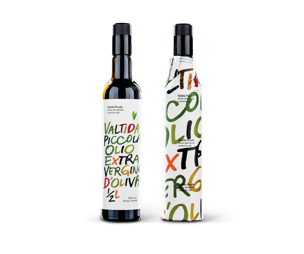 Valtida Piccola is an olive oil produced in the Istria region of Croatia. The aim behind the development of the packaging design was to differentiate this olive oil from similar ones on the market. The eye-catching typographic design plays with the effect of different colours, and boldly penned individual letters follow a harmonious colour spectrum. An additional wrap swathing the bottle furthermore emphasises the handcrafted manufacturing of the product. The same colourful print as on the bottle captivates the attention of the target group.