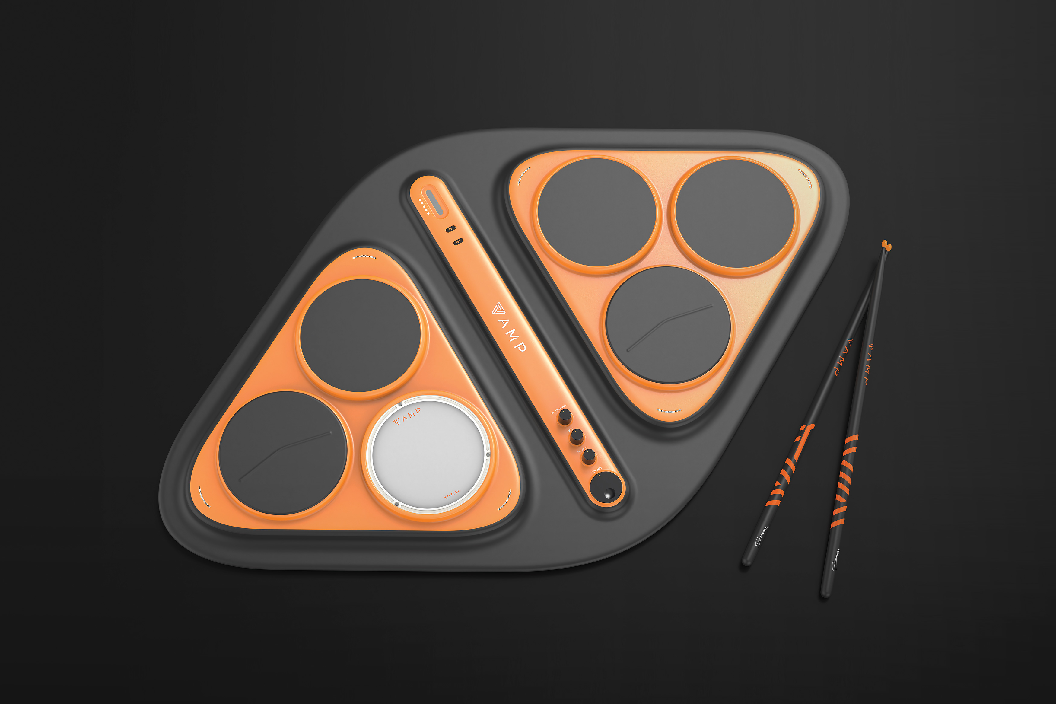 VAMP V-Kit is a portable electronic drum with a standby kit, enabling drummers to take their music on the go. It meets professional performance standards and features great aesthetics, replaceable snare drumheads, a physical controller, and a mobile app. The cymbal’s partition design prevents mishits, while a built-in sound system offers excellent sound quality. A dedicated showcase area for drumsticks also provides a personalised experience.