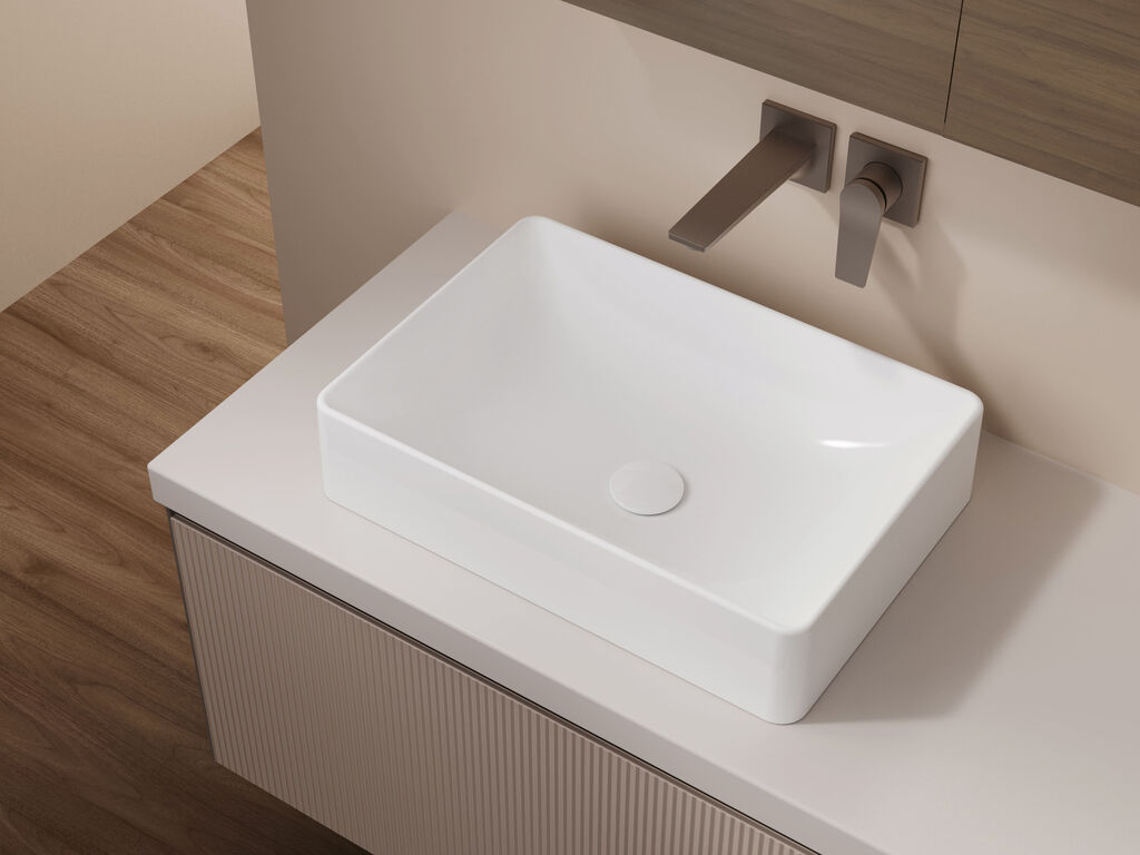 The ceramic countertop washbasin Variety is coated with a thermochromic glaze that changes colour depending on the temperature of the water. This feature makes it easy to see when the appropriate temperature has been reached. Variety is available with or without faucet holes in a range of different versions, all of which combine geometrically defined outer surfaces with a softly modelled inner contour. The hydrophobic surface coating effectively inhibits the accumulation of bacteria and makes cleaning easier.