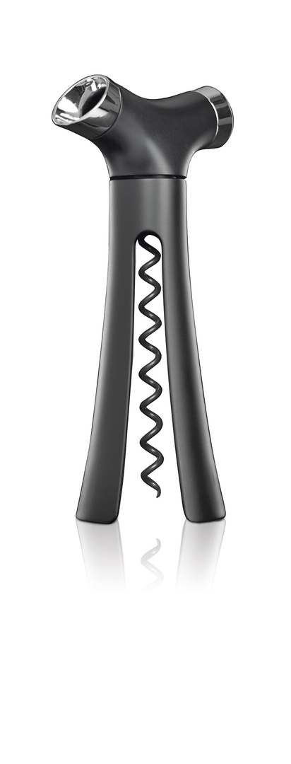 Verseur is a multifunctional wine bottle opener. It combines several tools which a wine aficionado needs for correct opening, serving and storing: an easily handled corkscrew, a foil cutter, a non-drip pourer and an efficient bottle cap. The opener is made of stainless steel and black rubber. The interplay of these materials gives it a classical, objective appearance.