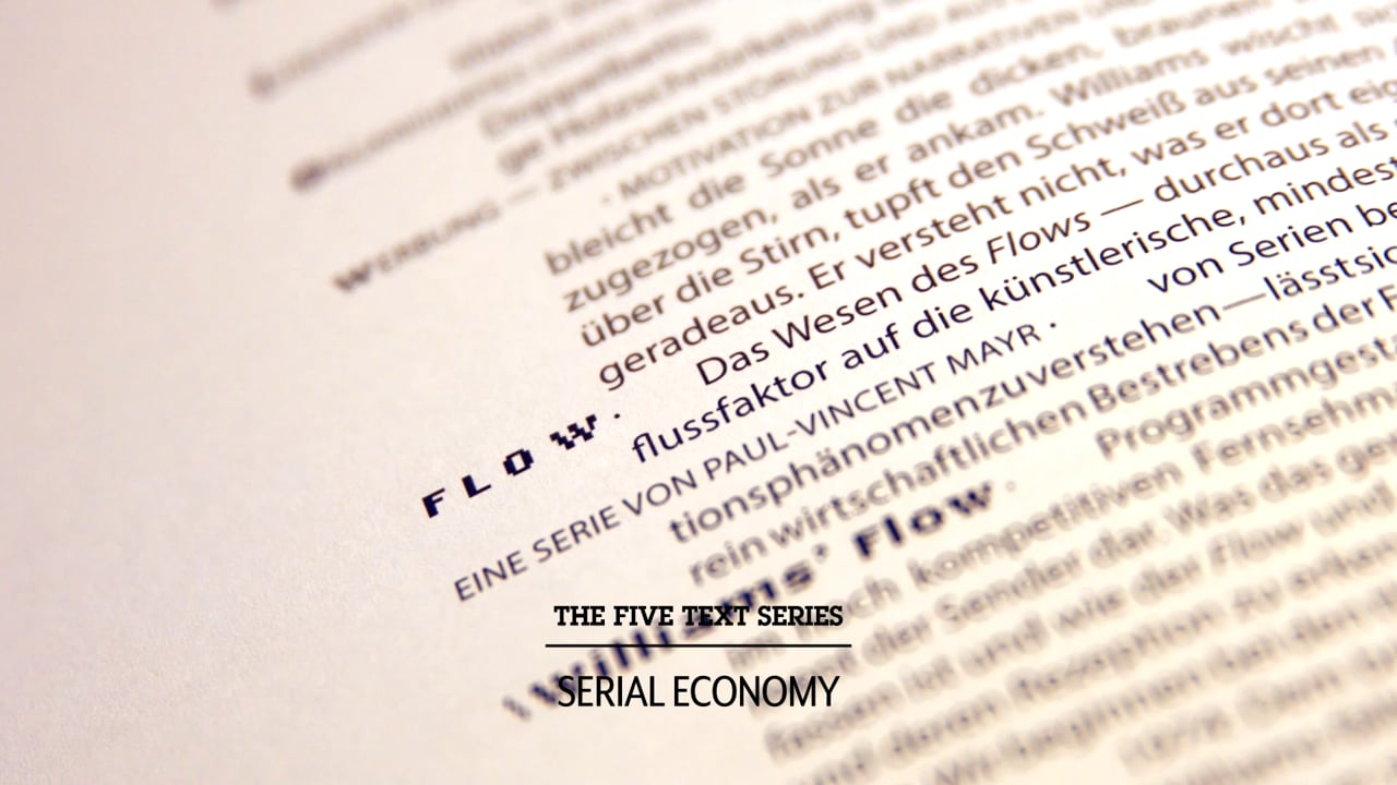 This anthology is about serial narration on television. The book is an approach to explaining the aesthetic, discursive and historical dimensions of seriality by simulating it: every text series — there are five, written by five authors — comprises several episodes which flow into each other as they do on TV. These series use elements like cliffhangers and intros, which are visualised by typography within the layout. Every page of this book is separated into an inner and an outer side. Every text series uses a certain font, hence there are no headlines or paragraphs. Sometimes two episodes become interlocked to emphasise the flow. The minimalistic emblem on the monochrome cover consists of punctuation marks symbolising serial narration.