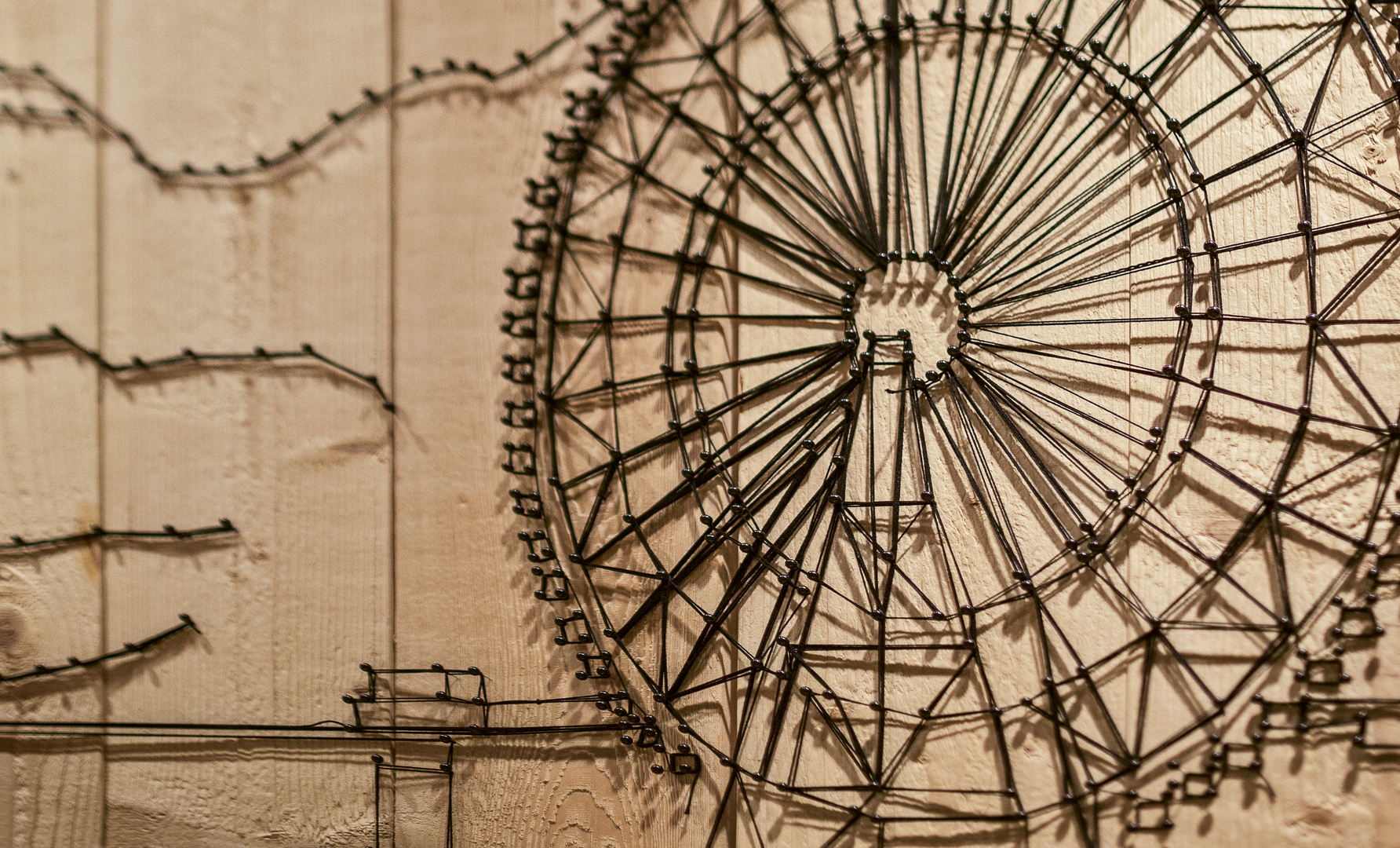 The fast-food restaurant WakuWaku Dammtor in Hamburg organised a relaunch with the aim of also positioning itself as an organic food store. The design approach visualises this through an open façade providing an unrestricted view of space. Almost entirely encased in solid wood panelling, this space serves as a stage to display the products in the WakuWaku world. The rough wooden surfaces contrast with a canopy of fine wire lamps and intricate wall sketches created by the artist Chris Rehberger using taut strings.