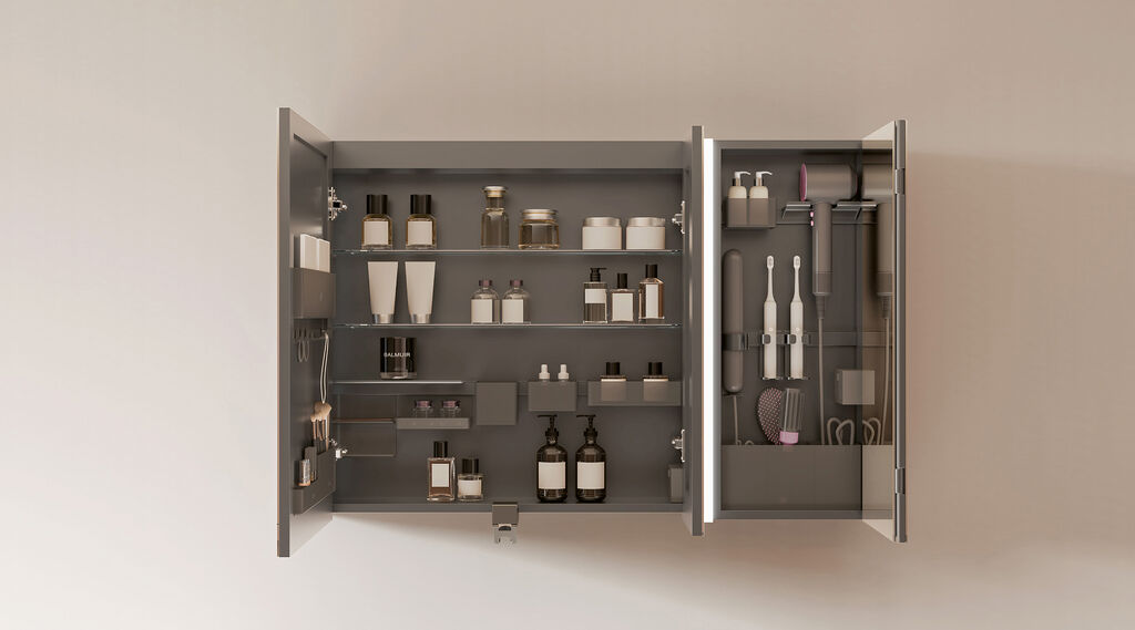 The WASHENJOY bathroom ensemble includes a washbasin and a three-door mirrored cabinet, both of which were specifically designed for convenient hair washing and hair care. The base cabinet with a drawer and a deep basin features a pull-out hand shower for thoroughly rinsing the hair. The upper cabinet is equipped with two light strips with gesture control and a fold-out mirror element to reduce the viewing distance. Separate areas in the interior for haircare and cosmetic items ensure a clear overview.