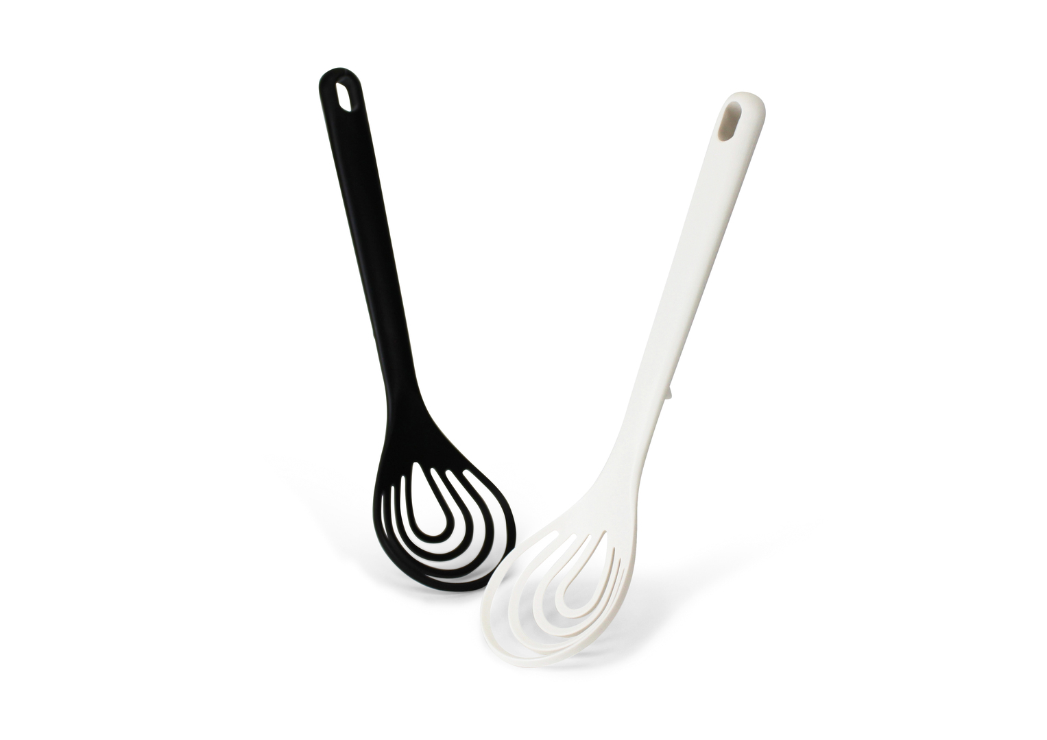 This kitchen utensil combines two functions: on the one hand it is a whisk with offset beating elements. With this, for example, cream can easily be whipped. On the other hand, due to its special shape, it can also be used as a spoon. No other kitchen utensil is needed to serve the whipped cream. Thanks to a hump at the back, the whisk can be laid hygienically on the table while you are cooking. It is easy to clean and can also be stored with minimum space requirement.