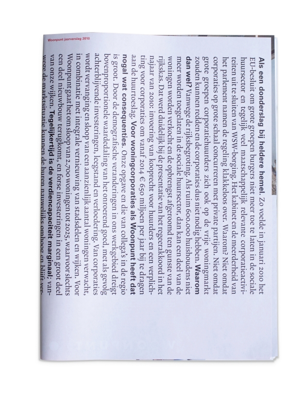 The annual report of the Woonpunt housing corporation aims to visually express that an organisation standing at the centre of society will take action if it is no longer able to do its work well, but yet, as in this case, wants to continue offering its tenants a pleasant living environment in the future. In order to emphasise that corporations came under pressure, due to a new legislation passed by the Dutch government and the European Union in 2010, Woonpunt is presented as an activist. However, this goes further than just “yelling boo”; rather, Woonpunt is shown as an organisation that tackles issues and finds solutions.The report consists of ten printed sheets that unfold and, on one side, feature action-based messages, such as “Excuse me. What are we actually doing?” and “Enough = Enough”, so to speak, messages with the appeal of a demonstration poster. The other side of the page features the past year in vivid and personal photo series, while the business figures are presented in clearly arranged lists.