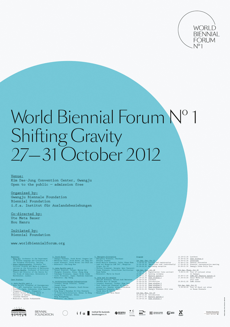 The World Biennial Forum, an initiative by the Biennial Foundation, is an international get-together on practical and actual issues. In this design concept, the blue circle is the supporting element returning in all communication tools. The blue circle can be seen as an abstraction of the world and a metaphor for the connecting capacity of the World Biennial Forum between art biennials all around the world. The subtle, transparent look and feel of the corporate identity represents the World Biennial Forum as an informal meeting point and open place for discussion.