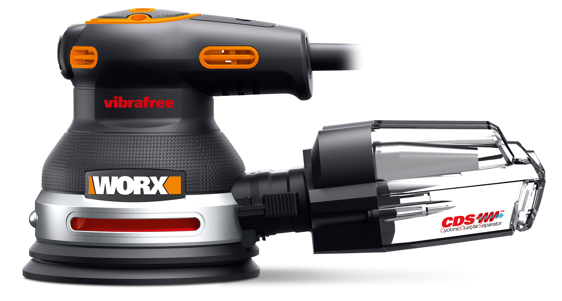 The Worx WX655 Vibrafree rotary sander features a dual oscillating pattern, with two separate sanding sheets rotating in opposing directions. The patented Vibrafree technology reduces vibrations and thus the vibrational strain on the user. The integrated CDS dust extraction system ensures a clean work environment and an unobstructed view of the workpiece. Once the dust box is full, it can be quickly emptied at the touch of a button.