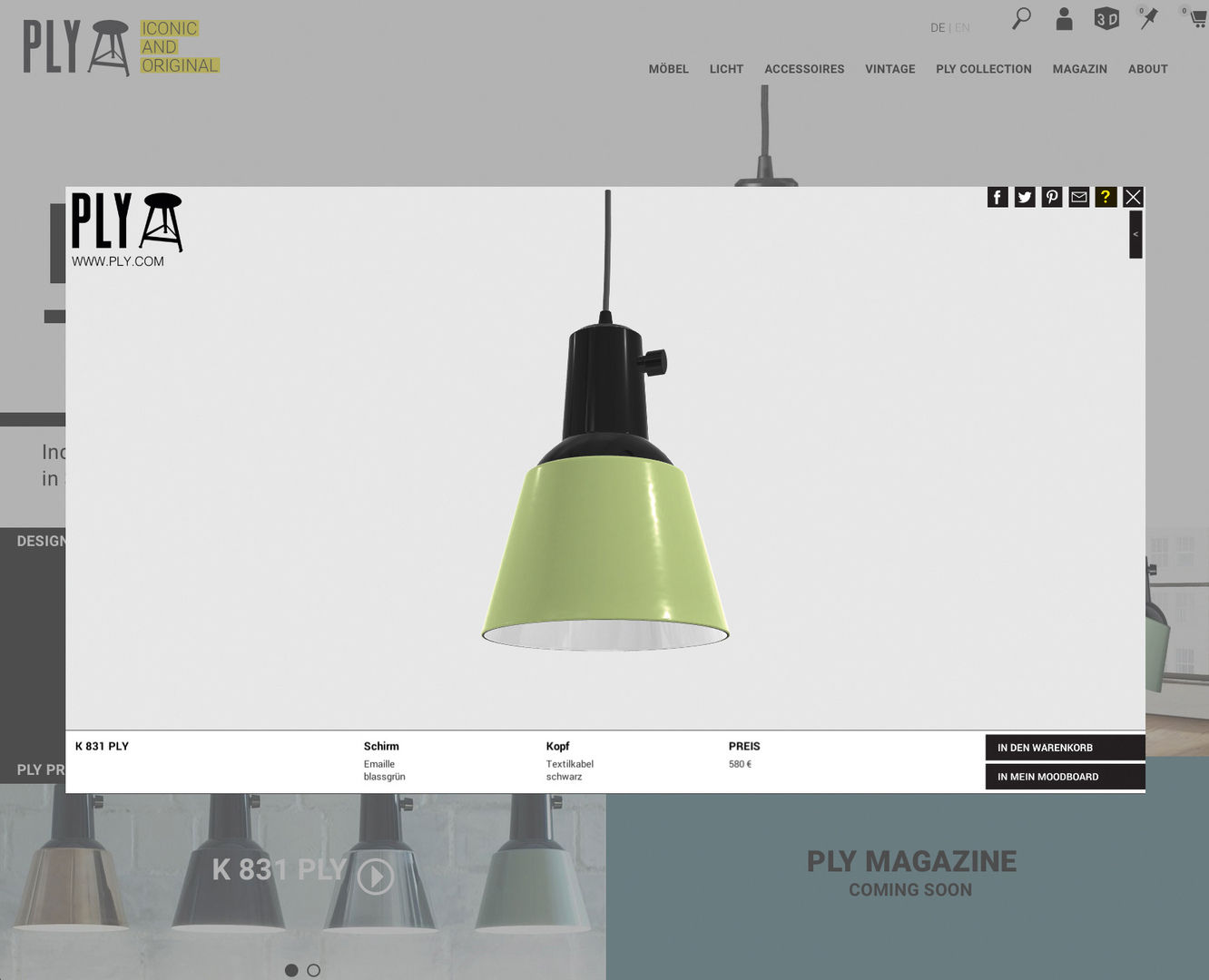 PLY is an interactive webshop for furniture, lighting and design classics. Two new configurations have been developed to make the presentation of products look more authentic. The 3D configurator presents furniture and lamps in almost photorealistic clearness. The programme shows surfaces such as enamel, powder coating and metal in outstanding detail and visual depth. The second configurator allows the creation of personal moodboards by giving users the ability to select by drag and drop any products in the shop and then arrange them in context with other products and materials in three different room scenarios.