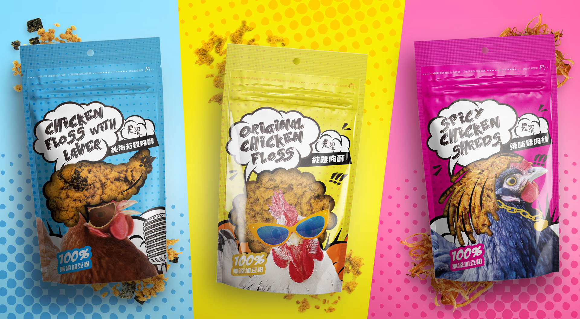 Chicken floss and shreds are popular foods in Chinese culture; hence there are many similar products on the market. In order to break out of the traditional market, the product has been repositioned not only as an ingredient for home cooking, but also as a snack for all ages. Therefore, the main goal of the new packaging design is to create a unique image. The product characters with their pop hairstyle have been developed to have a trendy, colourful and chicken-like appearance in order to target a younger consumer group.