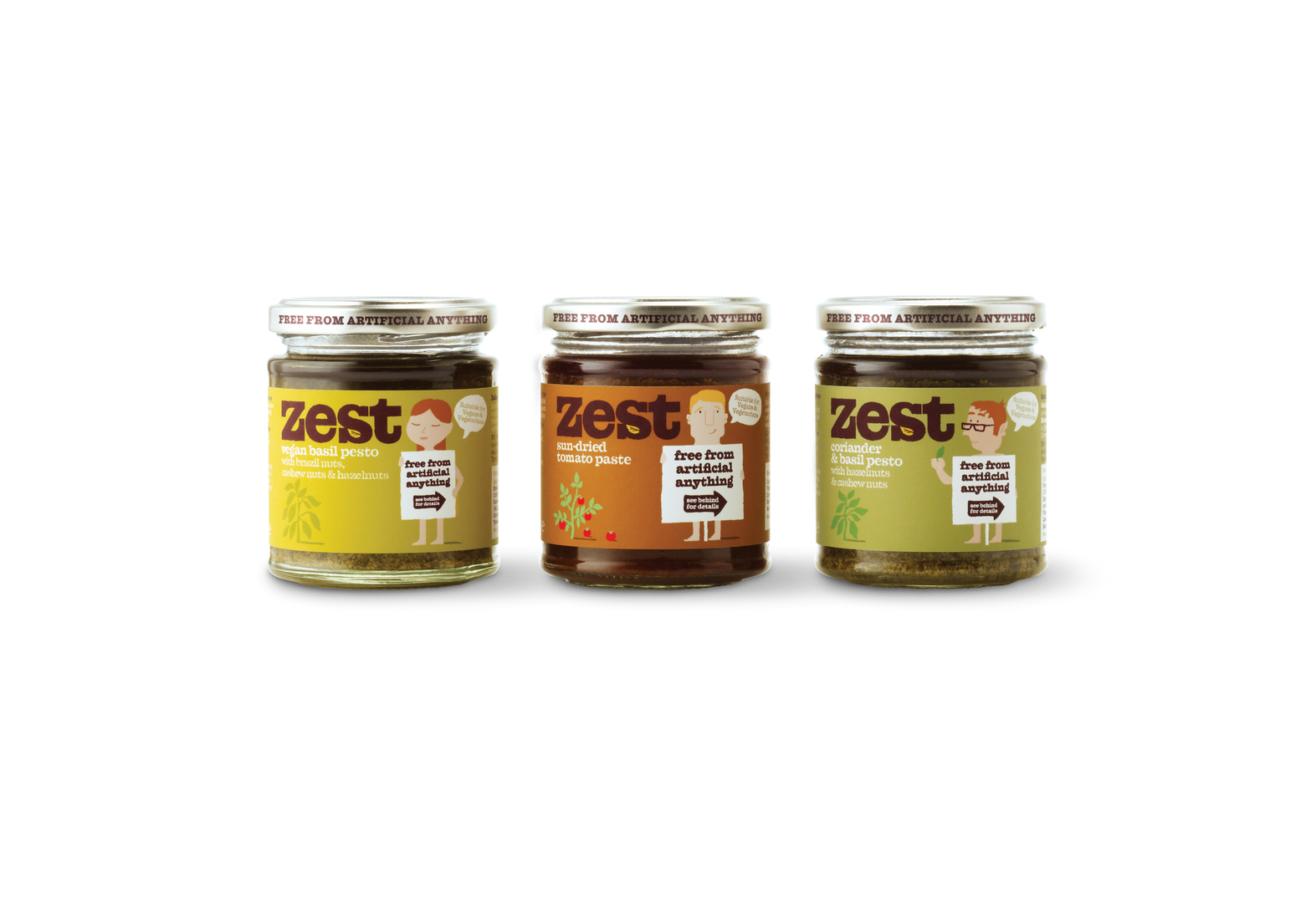 Zest is a range of pasta sauces and pestos that are free from artificial ingredients. Reacting to declining sales, the entire packaging design was reconfigured to revive the brand. In a crowded market, the brand needed a distinctive personality. Therefore, the designers created a team of personalities as eye-catching key visuals. The cute illustrations of naturists underline the naturalness of the products. In addition, a sign next to each character communicates the outstanding quality feature: “Free from artificial anything”.